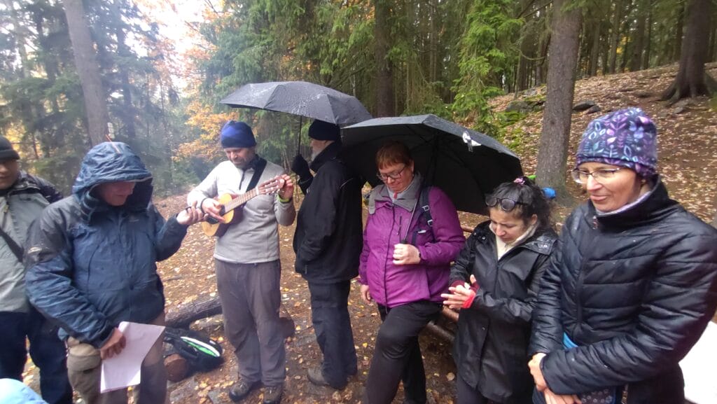 Po delší době se opět uskutečnil již tradiční regionální výlet. Sešli jsme se v komorním počtu asi 17 lidí a vliv na to měla zřejmě i nepříliš příznivá předpověď počasí. Sešli jsme se v obci Čenkov nedaleko Jinců a vydali se lesem na okruh, který na zavedl na Klouček a posléze na Slonovec, kde je větší ohniště. Pro zajímavost se zde nachází památník trempů. V té době jsme ale už byli docela mokří od deště, který se spustil po poledni. Podařilo se nám najít trochu suchého dřeva a pod deštníkem rozdělat oheň. Díky němu jsme se ohřáli a opekli pár soust k obědu, takže došlo i na společné chvály (opět pod deštníkem). Vzhledem k tomu, že stále pršelo, naše odhodlání zpívat nevydrželo moc dlouho, i vzhledem k tomu, že nám vytrvale kapalo na guitalele. I navzdory nepříznivému počasí to byla dobrá možnost strávit spolu sobotní den a díky všem, kteří se nenechali odradit předpovědí a dorazili.